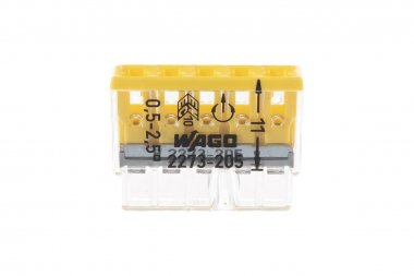 Соединительная клемма для быстрого монтажа 2273-205 5-ти проводная, 0,5-2,5 кв.мм, 450В, 24А, без пасты, 20шт 2536 оснащена прозрачным корпусом, что позволяет контролировать ввод кабеля.